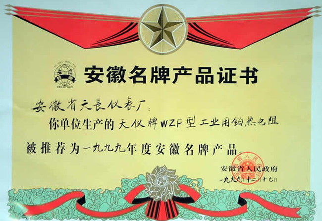 “天儀”牌WZP型工業(yè)用鉑熱電阻被安徽省人民政府推薦為九九年度安徽省名牌產品