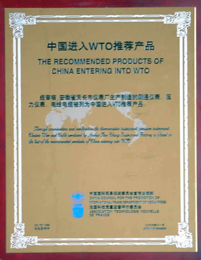 安徽省天長市儀表廠生產(chǎn)制造的測溫儀表、壓力儀表、電線電纜被列為中國進(jìn)入WTO推薦產(chǎn)品