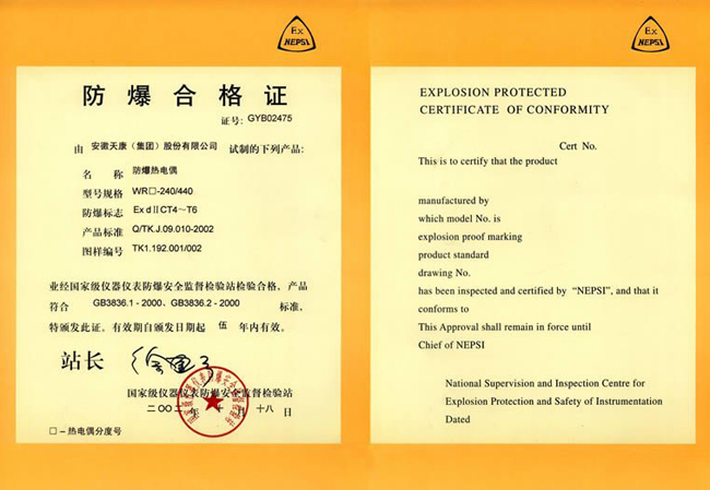 防爆熱電偶領取了由國家級儀器儀表防爆安全監(jiān)督檢驗站出具的防爆合格證