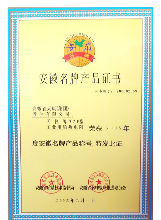 鉑電阻獲安徽?。玻埃埃的甓让飘a(chǎn)品稱號