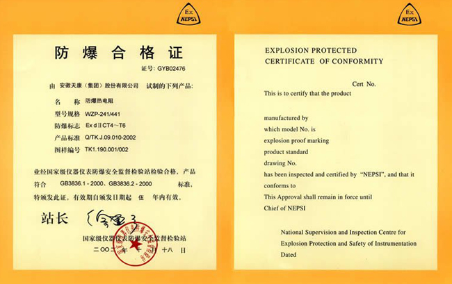 防爆熱電阻領(lǐng)取了由國家級儀器儀表防爆安全監(jiān)督檢驗站出具的防爆合格證