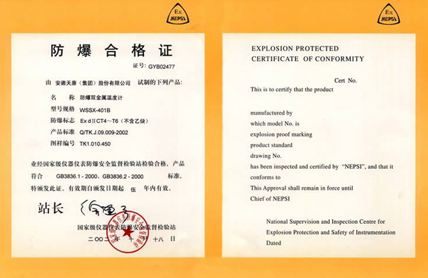 防爆雙金屬溫度計(jì)領(lǐng)取了由國(guó)家級(jí)儀器儀表防爆安全監(jiān)督檢驗(yàn)站出具的防爆合格證