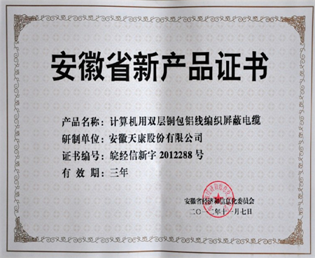 安徽省新產(chǎn)品證書(計算機(jī)用雙層銅包鋁線編織屏蔽電纜)