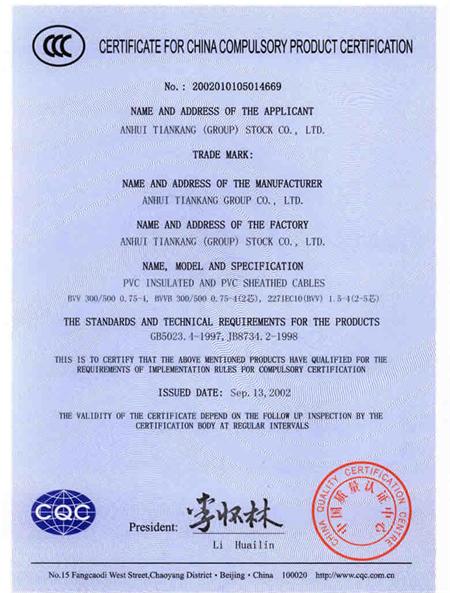 聚氯乙烯絕緣聚氯乙烯護(hù)套電纜被中國(guó)質(zhì)量認(rèn)證中心評(píng)為中國(guó)國(guó)家強(qiáng)制生產(chǎn)產(chǎn)品認(rèn)證證書英文版