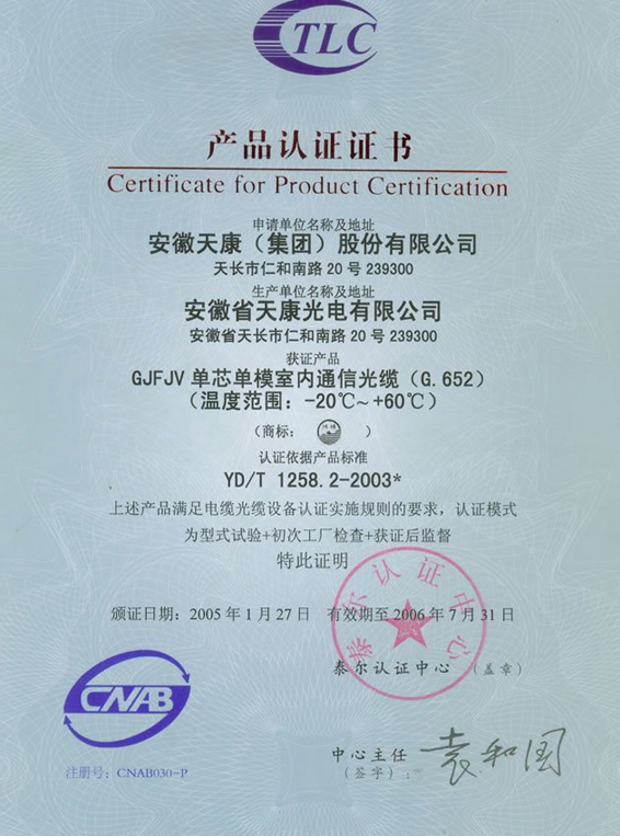室內(nèi)通訊光纜產(chǎn)品認(rèn)證證書(shū)