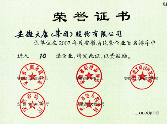 07年安徽省民營十強(qiáng)企業(yè)證書