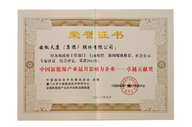 2012中國新能源產(chǎn)業(yè)最具影響力企業(yè)卓越貢獻獎(證書)