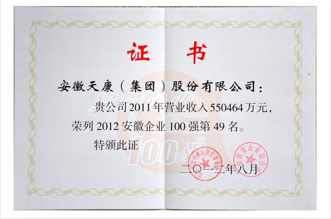 2012安徽百?gòu)?qiáng)第49名榮譽(yù)證書